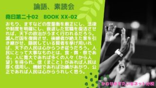子張(しちょう)孔子(こうし)に問(と)うて曰(い)わく、何如(いか)なれば斯(こ)れ以(もっ)て政(まつりごと)に従(したが)うべき。子(し)曰(のたま)わく、五美(ごび)を尊(たっと)び、四悪(しあく)を屛(しりぞ)くれば、斯(こ)れ以(もっ)て政(まつりごと)に従(したが)うべし。子張(しちょう)曰(い)わく、何(なに)をか五美(ごび)と謂(い)う。子(し)曰(のたま)わく、君子(くんし)は恵(けい)して費(ついや)さず、労(ろう)して怨(うら)みず、欲(ほっ)して貪(むさぼ)らず、泰(ゆたか)にして驕(おご)らず、威(い)にして猛(たけ)からず。子張(しhちょう)曰(い)わく、何(なに)をか恵(けい)して費(ついや)さずと謂(い)う。子(し)曰(のたま)わく、民(たみ)の利(り)とする所(ところ)に因(よ)りて之(これ)を利(り)す。斯(こ)れ亦(また)恵(けい)して費(ついや)さざるにあらずや。労(ろう)すべきを択(えら)びて之(これ)を労(ろう)す。又(また)誰(だれ)をか怨(うら)みん。仁(じん)を欲(ほっ)して仁(じん)を得(え)たり。又(また)焉(なに)をか貧(むさぼ)らん。君子(くんし)は衆寡(しゅうか)と無(な)く、小大(しょうだい)と無(な)く、敢(あえ)て慢(あなど)ること無(な)し。斯(こ)れ亦(また)泰(ゆたか)にして驕(おご)らざるにあらずや。君子(くんし)は其(そ)の衣冠(いかん)を正(ただ)しくし、其(そ)の瞻視(せんし)を尊(たっと)くす。厳然(げんぜん)として人(ひと)望(のぞ)みて之(これ)を畏(おそ)る。斯(こ)れ亦(また)威(い)にして猛(たけ)からざるにあらずや。子張(しちょう)曰(い)わく、何(なに)をか四悪(しあく)と謂(い)う。子(し)曰(のたま)わく、教(おし)えずして殺(ころ)す、之(これ)を虐(ぎゃく)と謂(い)う。戒(いまし)めずして成(な)るを視(み)る、之(これ)を暴(ぼう)と謂(い)う。令(れい)を慢(ゆる)くして期(き)を致(いた)す、之(これ)を賊(ぞく)と謂(い)う。之(これ)を猶(ひと)しく人(ひと)に与(あた)うるに、出納(すいとう)の吝(やぶさか)なる、之(これ)を有司(ゆうし)と謂(い)う。