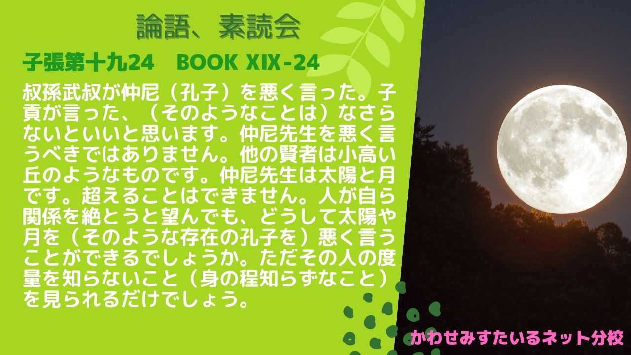 叔孫武叔(しゅくそんぶしゅく)、仲尼(ちゅうじ)を毀(そし)る。子貢(しこう)曰(い)わく、以(もっ)て為(な)すこと無(な)かれ。仲尼(ちゅうじ)は毀(そし)るべからざるなり。他人(たにん)の賢者(けんじゃ)は丘陵(きゅうりょう)なり。猶(なお)踰(こ)ゆべきなり。仲尼(ちゅうじ)は日月(じつげつ)なり。得(え)て踰(こ)ゆること無(な)し。人(ひと)自(みずか)ら絶(た)たんと欲(ほっ)すと雖(いえど)も、其(そ)れ何(なん)ぞ日月(じつげつ)を傷(やぶ)らんや。多(まさ)に其(そ)の量(りょう)を知(し)らざるを見(み)るなり。