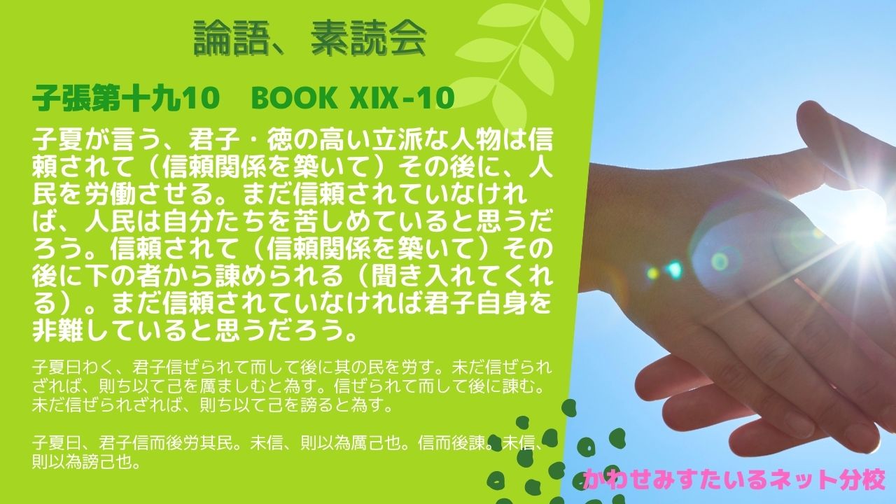 子夏が言う、君子・徳の高い立派な人物は信頼されて(信頼関係を築いて)その後に、人民を労働させる。まだ信頼されていなければ、人民は自分たちを苦しめていると思うだろう。信頼されて(信頼関係を築いて)その後に下の者から諌められる(聞き入れてくれる)。まだ信頼されていなければ君子自身を非難していると思うだろう。|「論語」子張第十九10