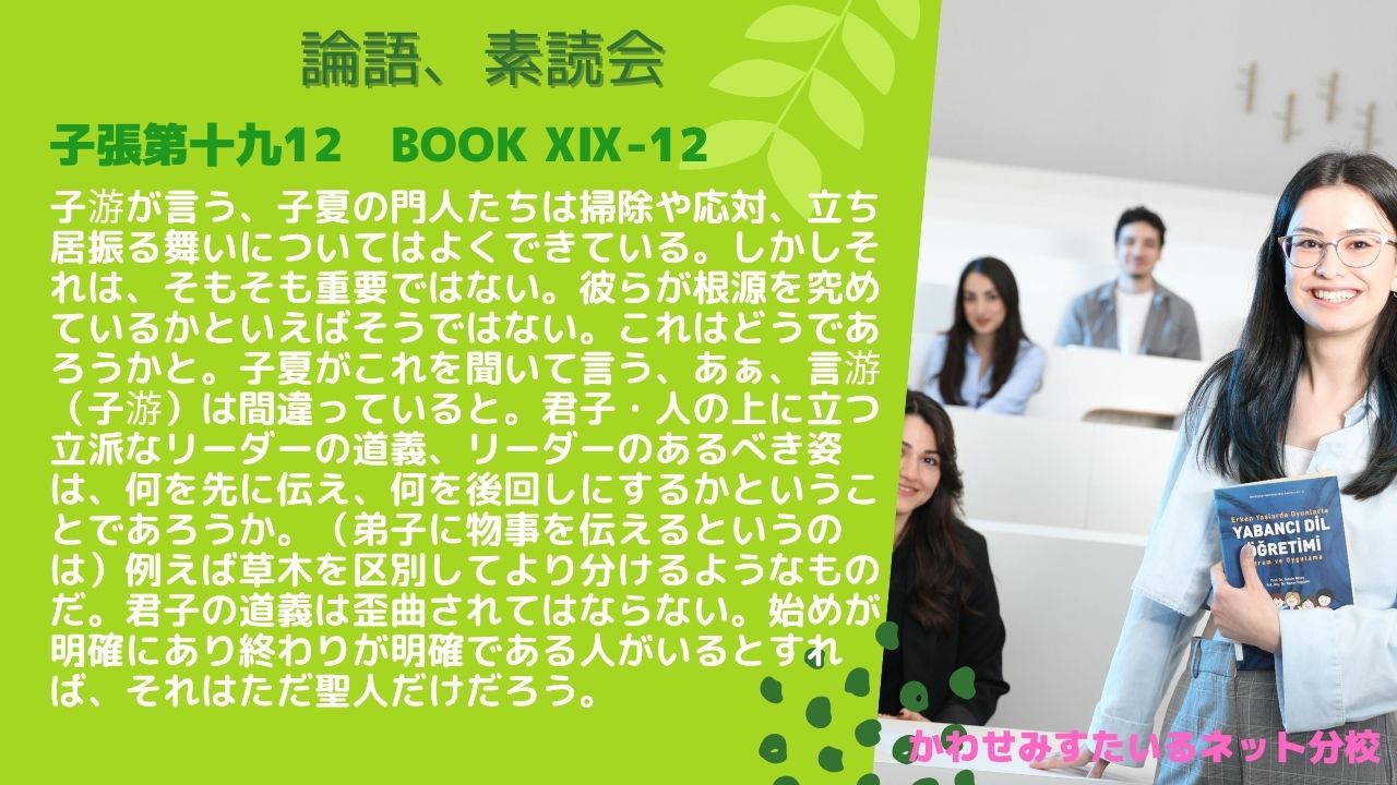 子游(しゆう)曰(い)わく、子夏(しか)の門人(もんじん)小子(しょうし)、洒掃(さいそう)応対(おうたい)進退(しんたい)に当(あた)りては、則(すなわ)ち可(か)なり。抑(そもそも)末(すえ)なり。之(これ)に本(もと)づくれば則(すなわ)ち無(な)し。之(これ)を如何(いかん)。子夏(しか)之(これ)を聞(き)きて曰(い)わく、噫(ああ)、言游(げんゆう)過(あやま)てり。君子(くんし)の道(みち)は、孰(いず)れをか先(さき)に伝(つた)え、孰(いず)れをか後(のち)に倦(う)まん。諸(これ)を草木(そうもく)の区(く)して以(もっ)て別(わか)つに譬(たと)う。君子(くんし)の道(みち)は、焉(いずく)んぞ誣(し)うべけんや。始(はじめ)有(あ)り卒(おわり)有(あ)る者(もの)は、其(そ)れ唯(ただ)聖人(せいじん)か。
