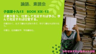 子夏(しか) … 商(しょう)。姓は卜(ぼく)、名は商(しょう)、字(あざな)は子夏(しか)。孔子より四十四歳年下。衛の人。つつましやかでまじめな人柄で、また消極的だったらしい。「論語」の登場人物|論語、素読会