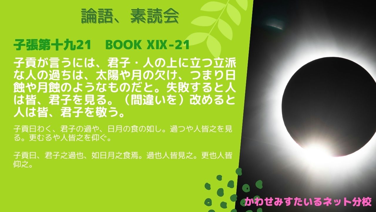 子貢が言うには、君子・人の上に立つ立派な人の過ちは、太陽や月の欠け、つまり日蝕や月蝕のようなものだと。失敗すると人は皆、君子を見る。(間違いを)改めると人は皆、君子を敬う。